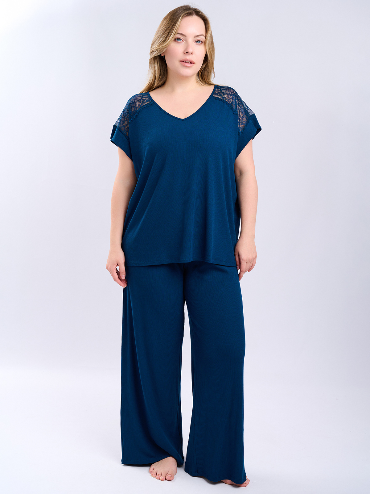 Женская пижама Indefini выполнена в насыщенном синем цвете из мягкой, приятной к телу вискозной ткани с добавлением эластана. Комплект включает в себя стильную топ-майку с V-образным вырезом и декоративными кружевными вставками на плечах, а также свободные широкие брюки на мягкой эластичной резинке.