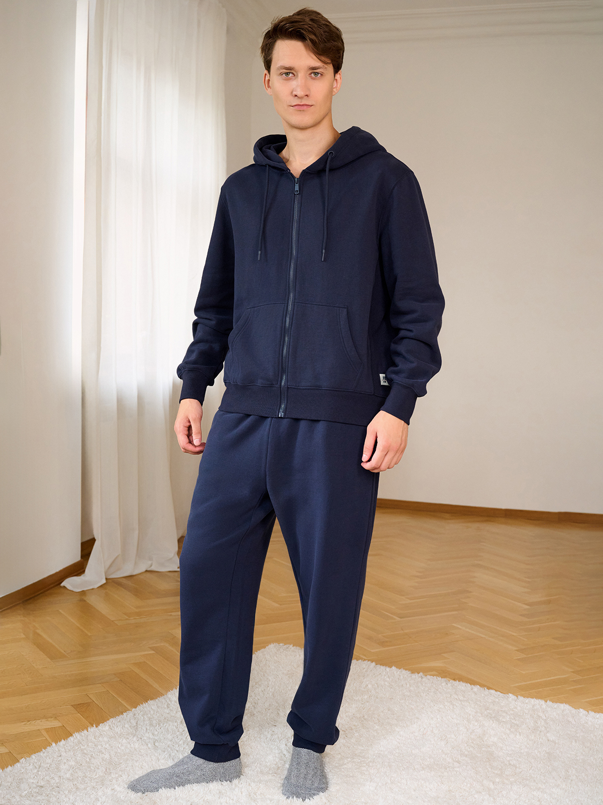 Мужской трикотажный утепленный костюм Indefini с начесом выполнен в глубоком, насыщенном темно-синем цвете — оттенке, который подчеркивает уверенность и стиль даже в повседневной одежде. Комплект состоит из теплой толстовки на молнии с капюшоном, а также брюк с эластичной резинкой по талии и шнурком для регулировки посадки.