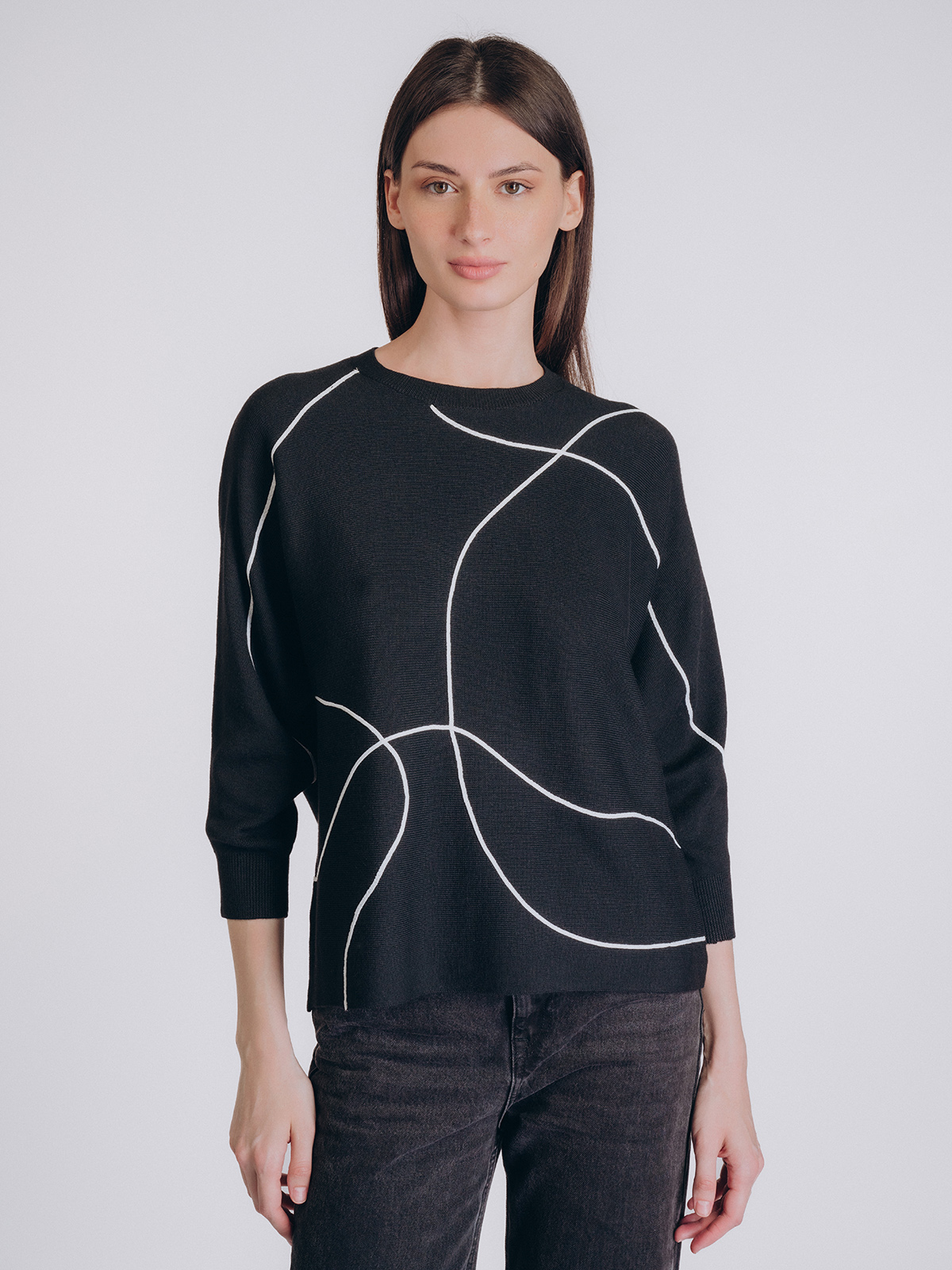 Женская кофта бренда Indefini выполнена в глубокий черный цвет с абстрактным светлым узором. Модель изготовлена из мягкой смесовой ткани с высоким содержанием полиэстера, а также добавлением шерсти, нейлона и акрила.