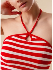 Женский топ от торговой марки Индефини. Топ выполнен из вискозы в тонкий рубчик, красно-белого цвета в полоску, без рукавов с регулируемыми завязками, укороченный.