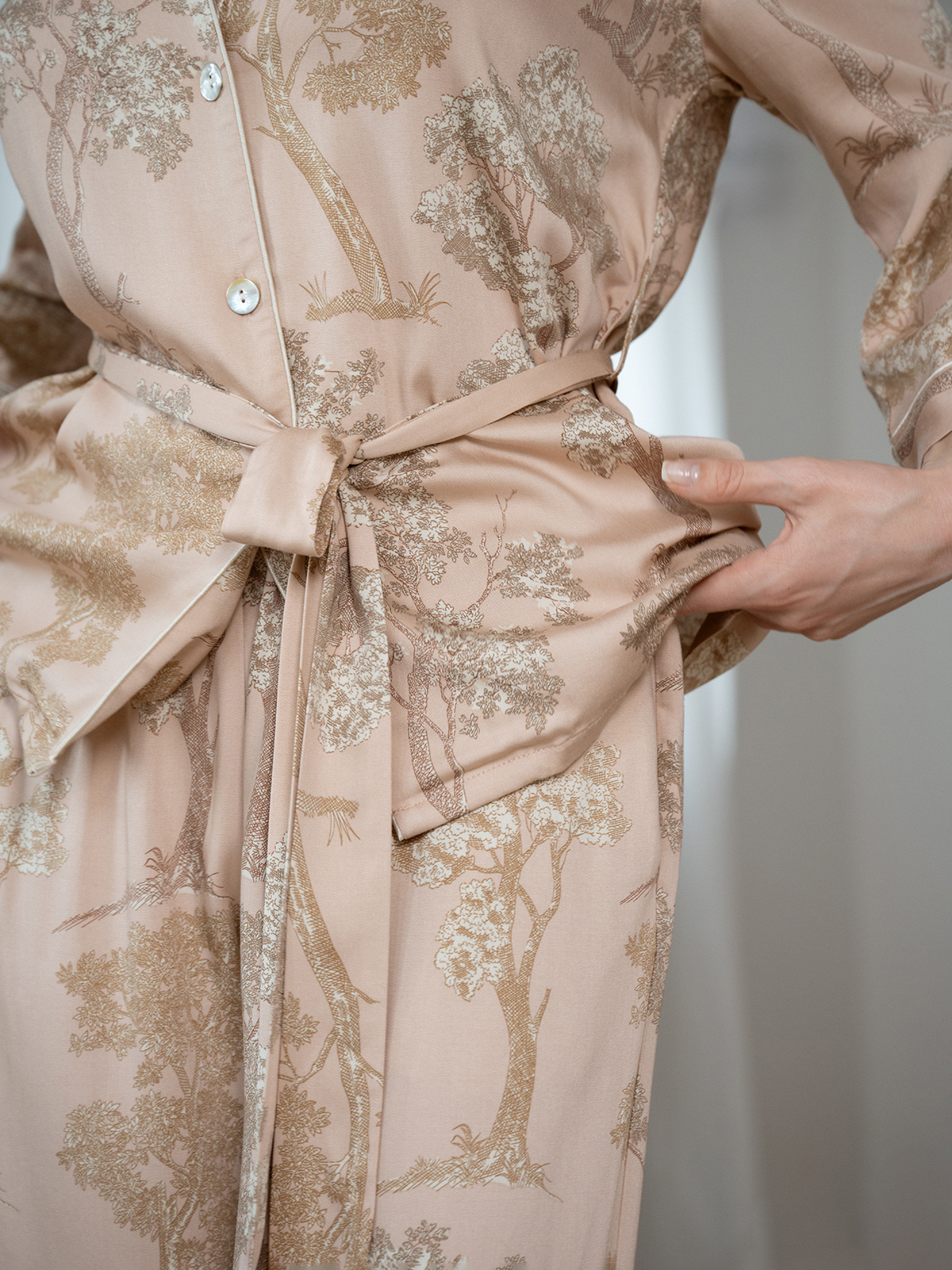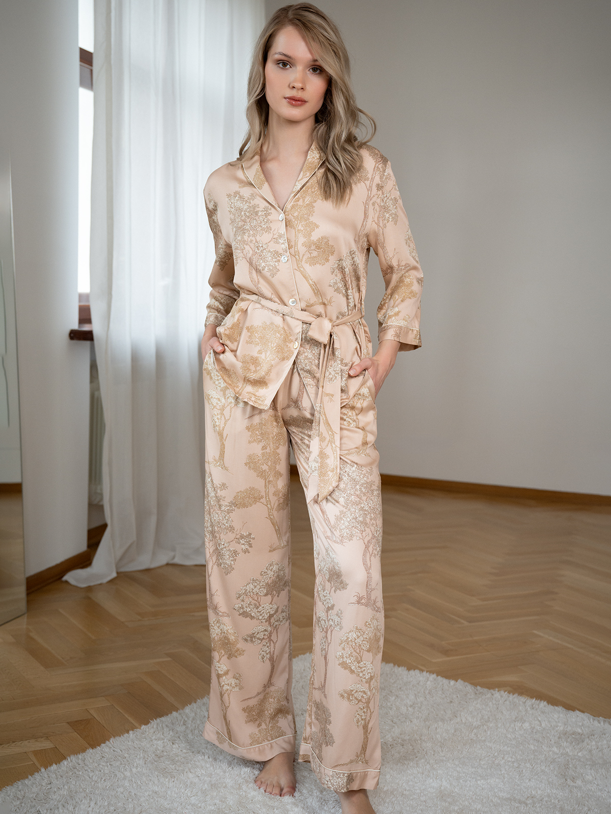 Женская пижама Indefini выполнена в нежном розовом цвете с изысканным растительным принтом. Комплект состоит из рубашки на пуговицах с отложным воротником, рукавами и поясом на талии, а также прямых брюк на мягкой эластичной резинке.