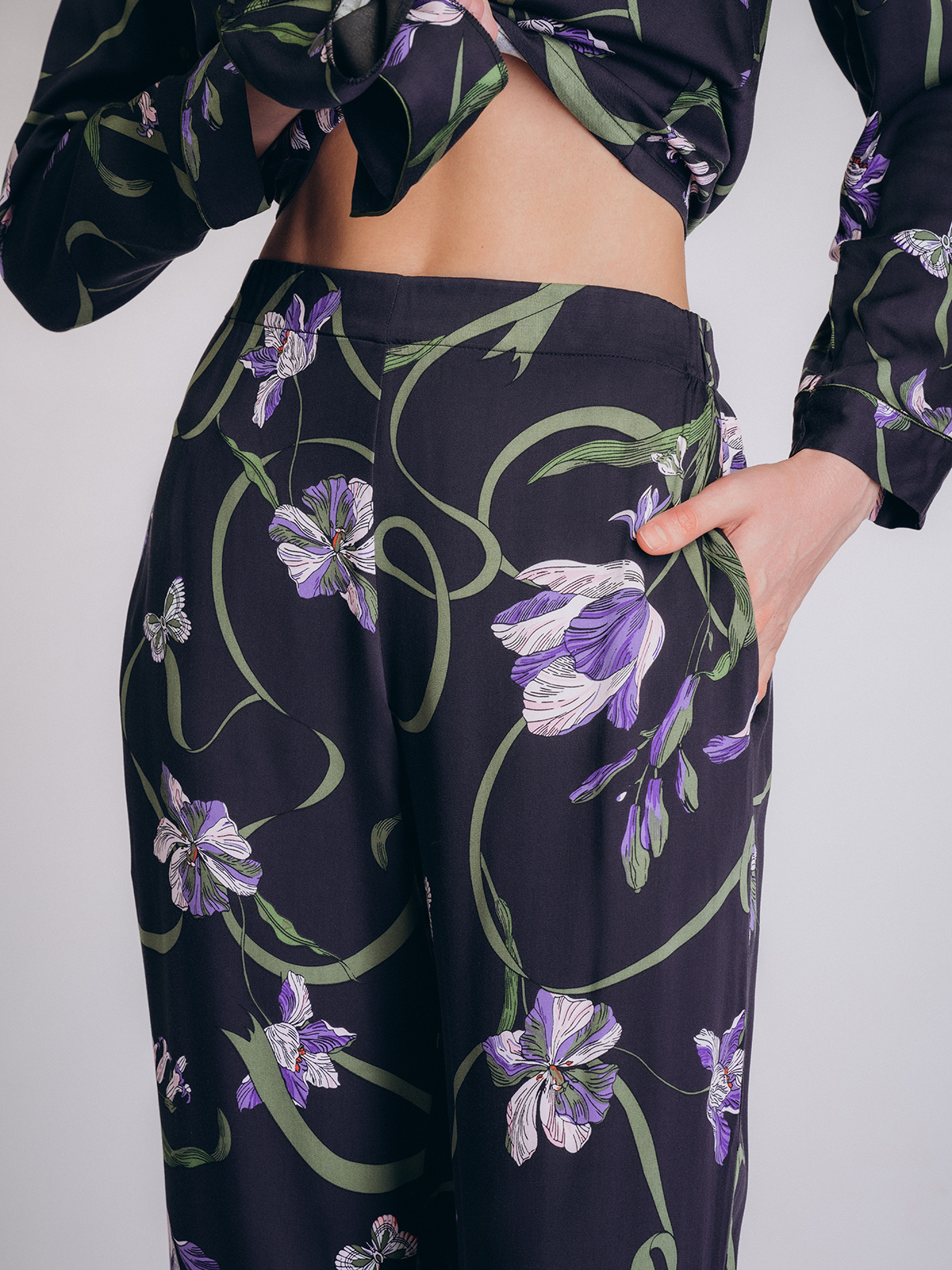 Принт: тёмный фон с цветочным узором в зелёных и фиолетовых тонах.
