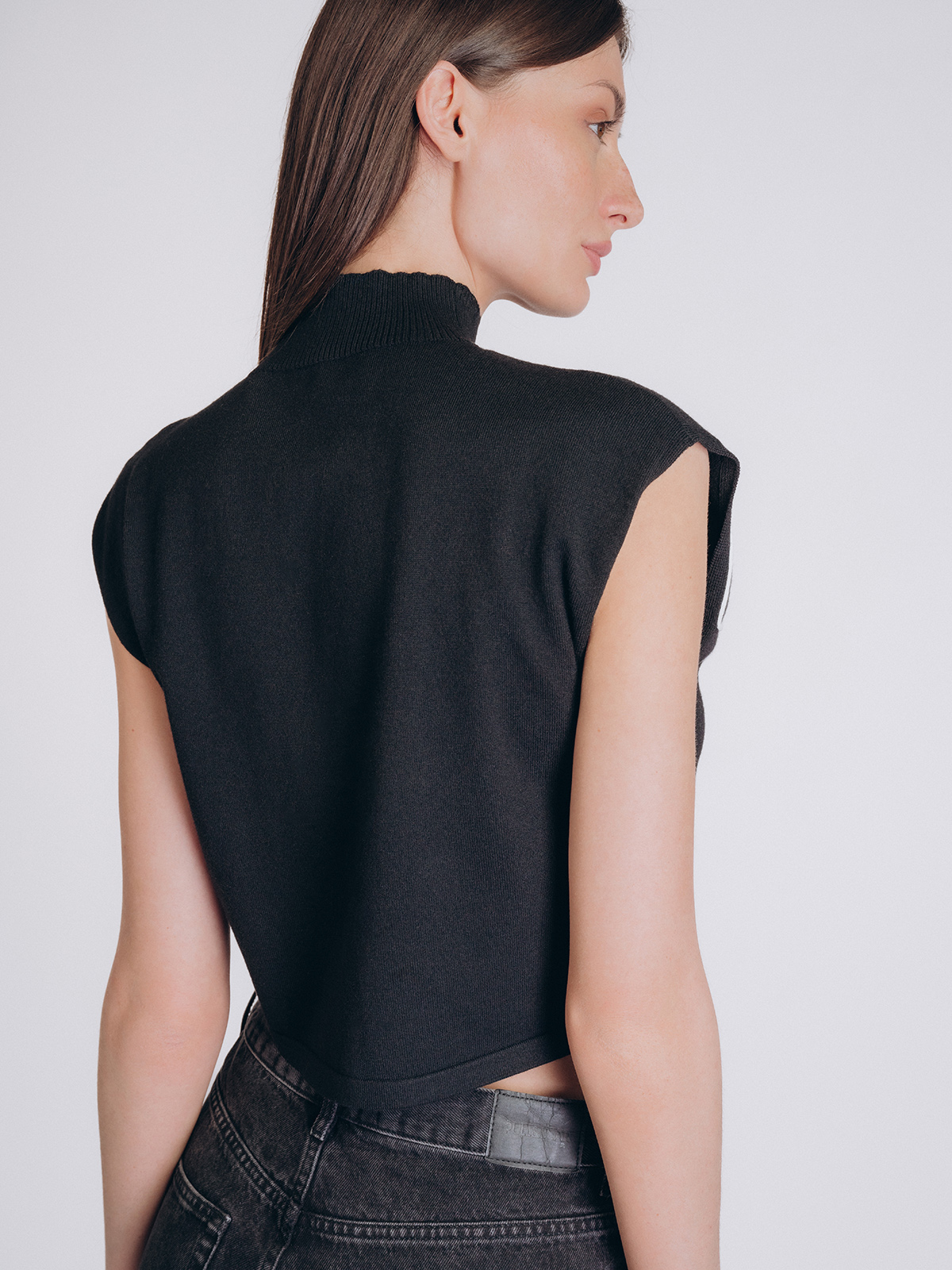 Высокий ворот и свободный крой подчеркивают современный стиль, а лаконичный дизайн делает топ универсальным элементом гардероба. Глубокий черный оттенок и оригинальный принт придают образу выразительность и актуальность.