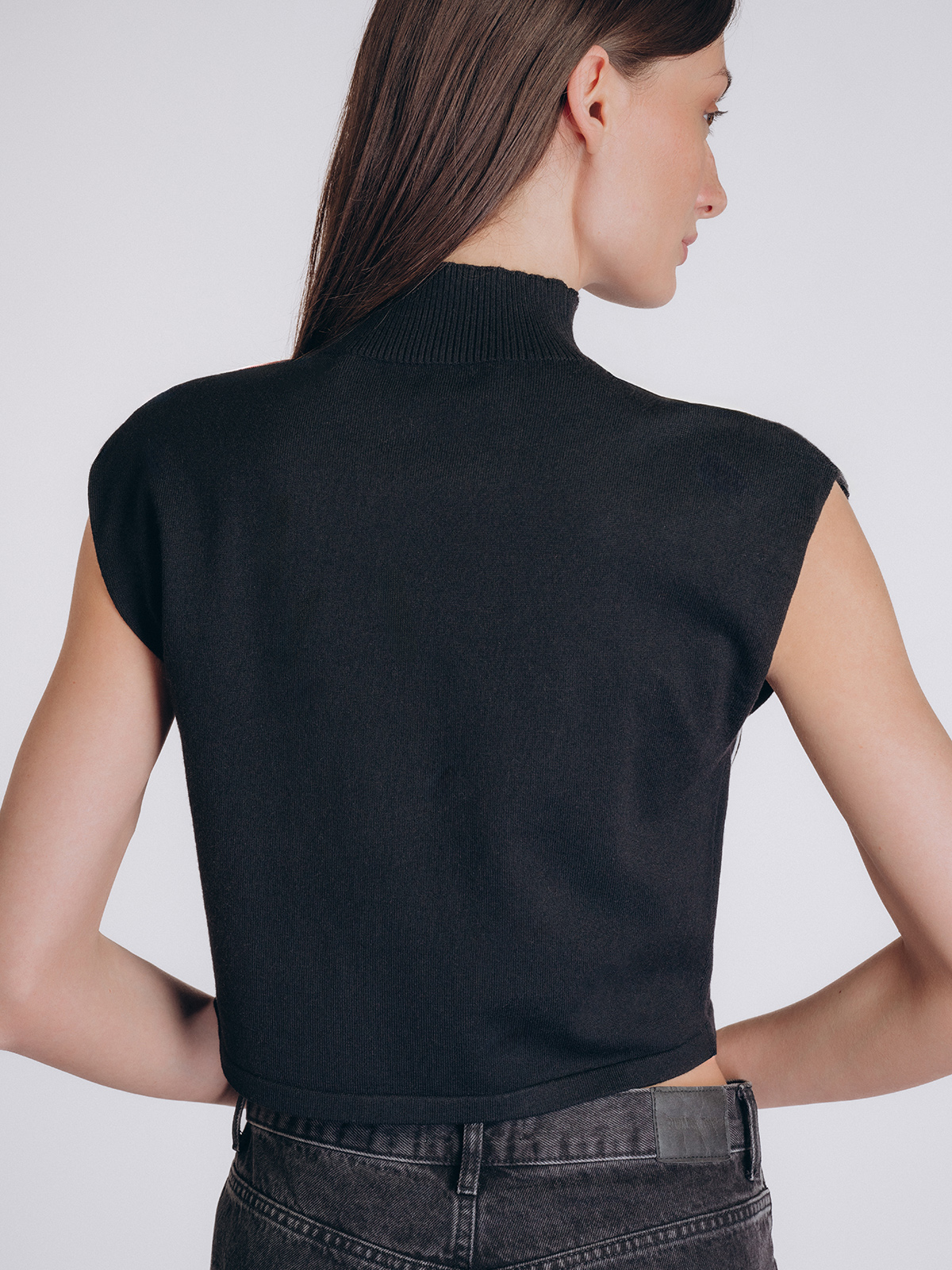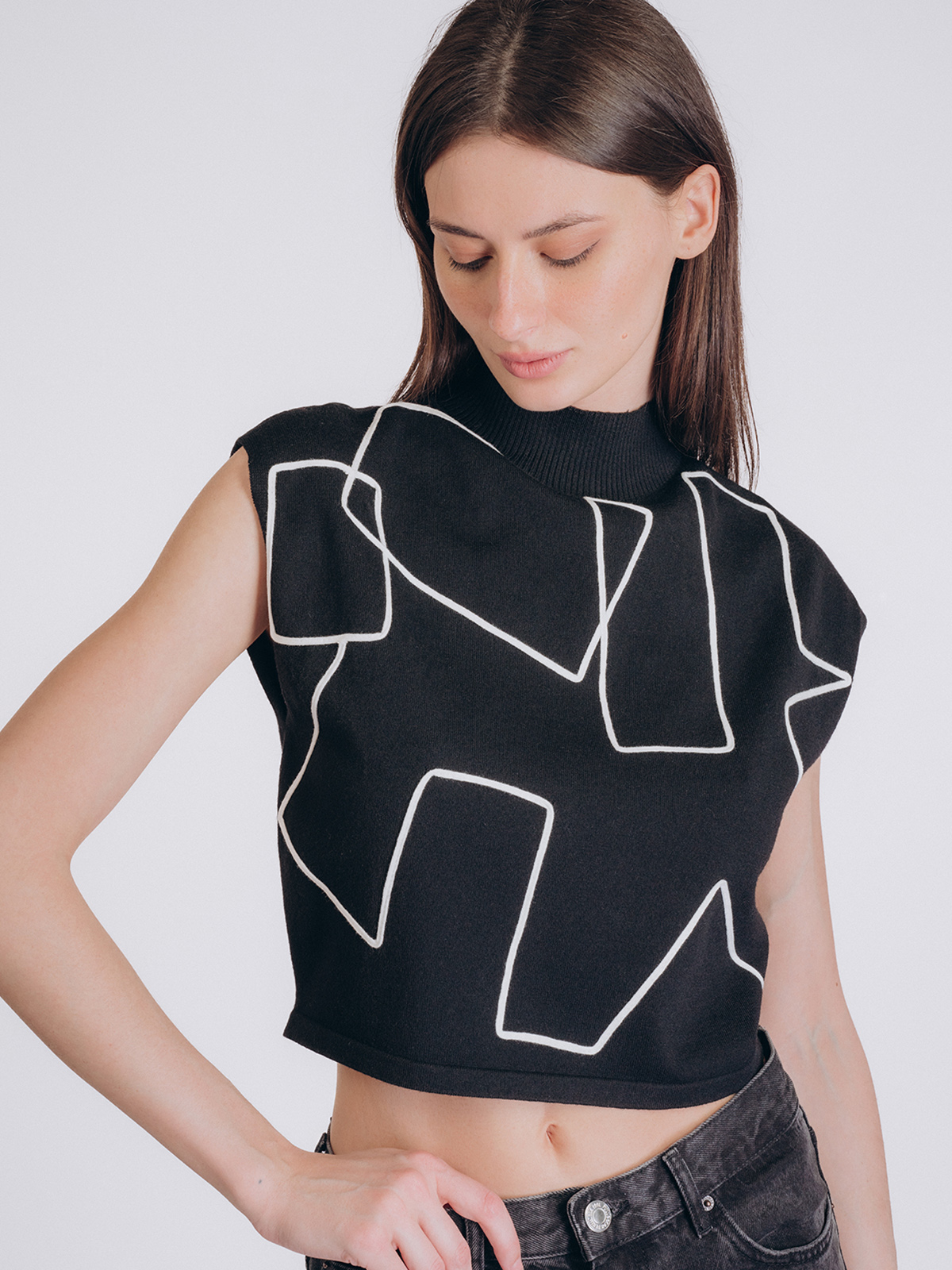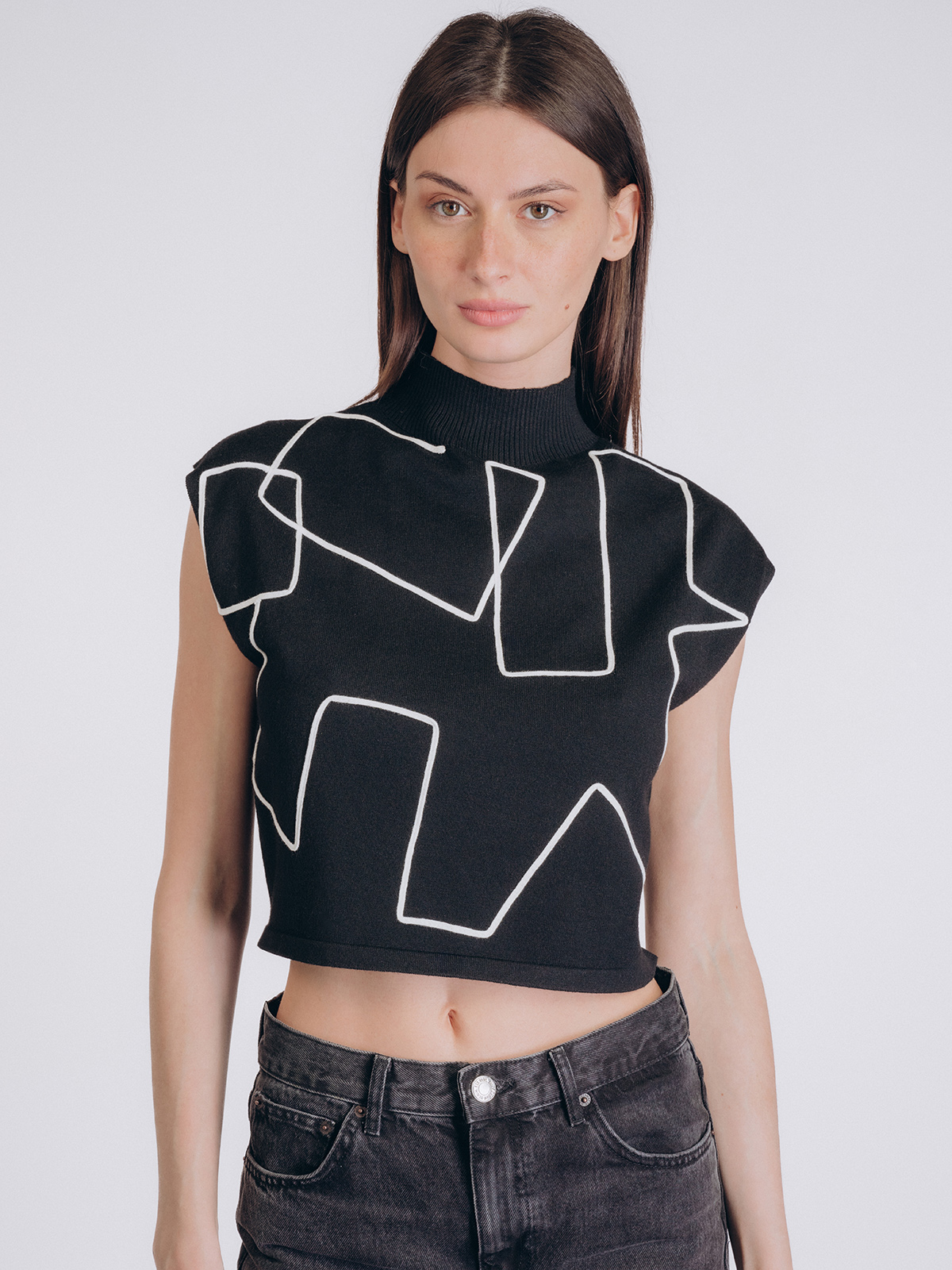 Женский укороченный джемпер без рукавов бренда Indefini выполнен в классическом черном цвете с контрастным белым геометрическим узором. Модель изготовлена из мягкой и приятной к телу ткани, которая обеспечивает комфорт и свободу движений.
